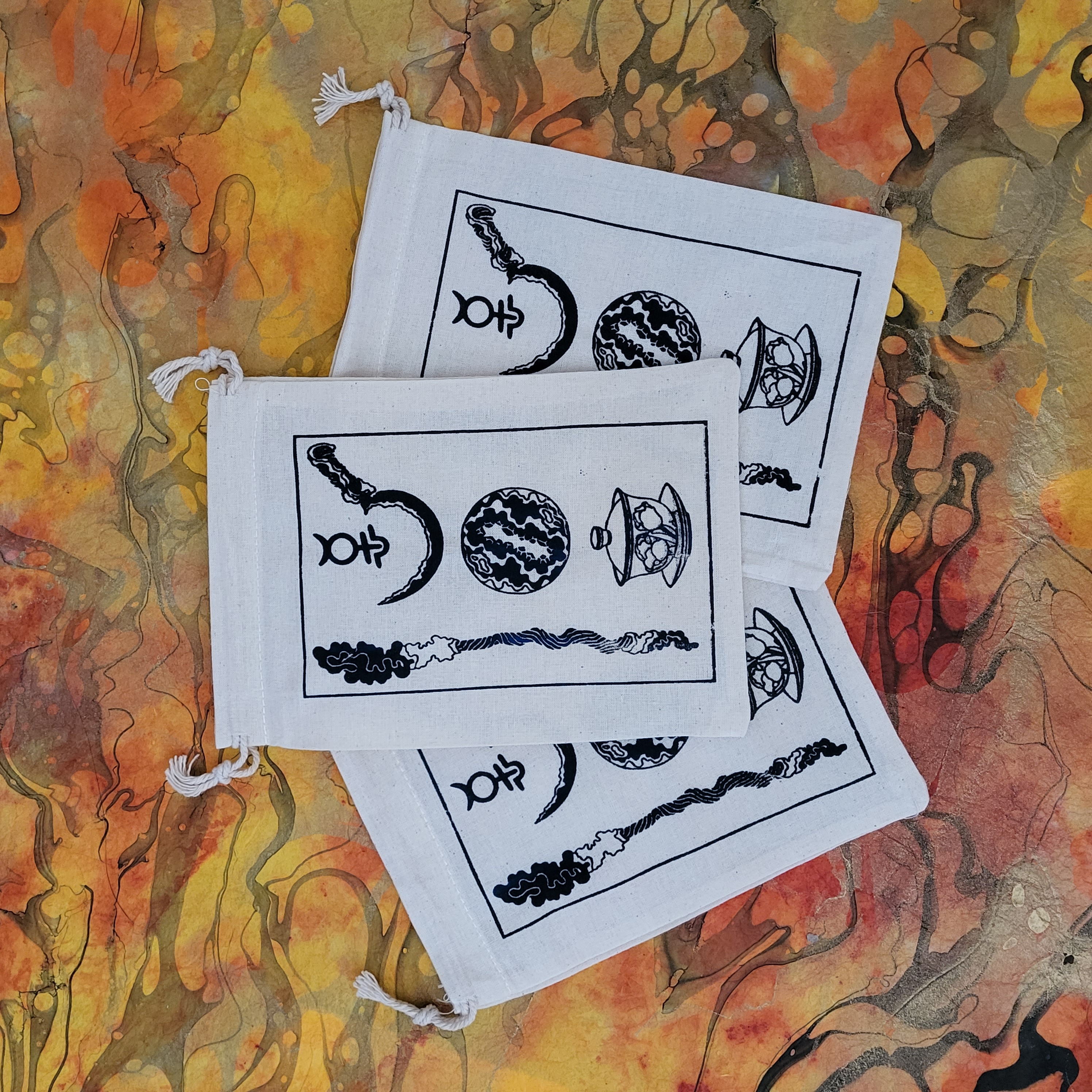 The Quicksilver Deck Bag is a 5"x7" untreated cotton drawstring pouch with a Quicksilver Tarot themed graphic screen printed on the front by yours truly, with love, and also probably tears.