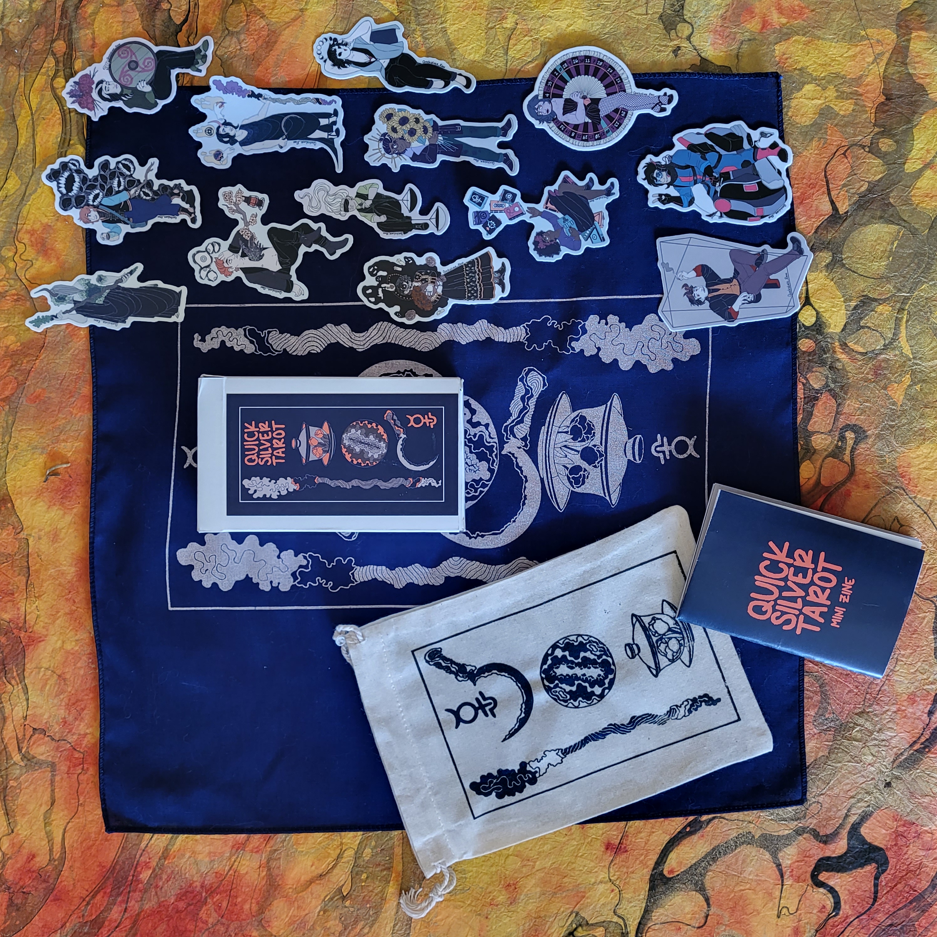 Quicksilver Tarot Cloth: 14"x14" 100% navy cotton cloth with a Quicksilver Tarot themed graphic lovingly screenprinted on the front by yours truly, probably with help from my mom.