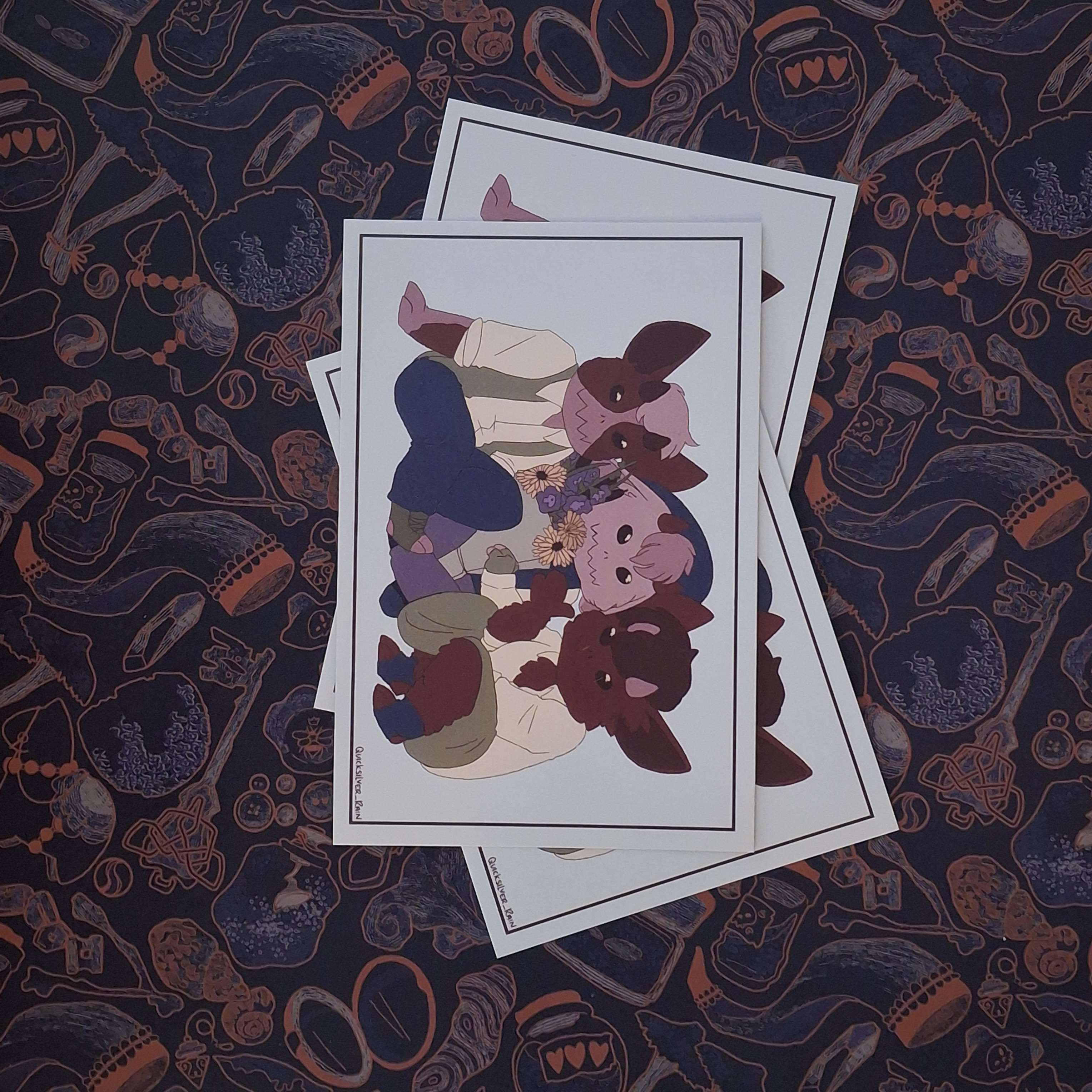 Each print is full colour printed on 4x6 matte cardstock, backed with cupboard and lovingly sealed in a plastic sleeve to protect it from the elements. I'll even give it a little kiss before putting it in the mailbox, if you want.
